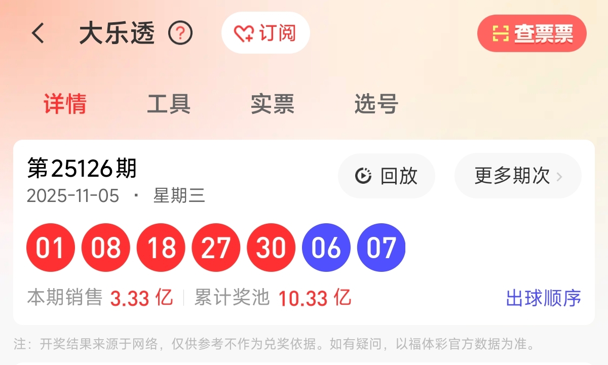 首先让我们回顾一下上期大乐透25126期的开奖为01、08、18、27、30,蓝球06、07。前区和值84,前区跨度29,区间比为2:1:2,奇偶比为2:3。