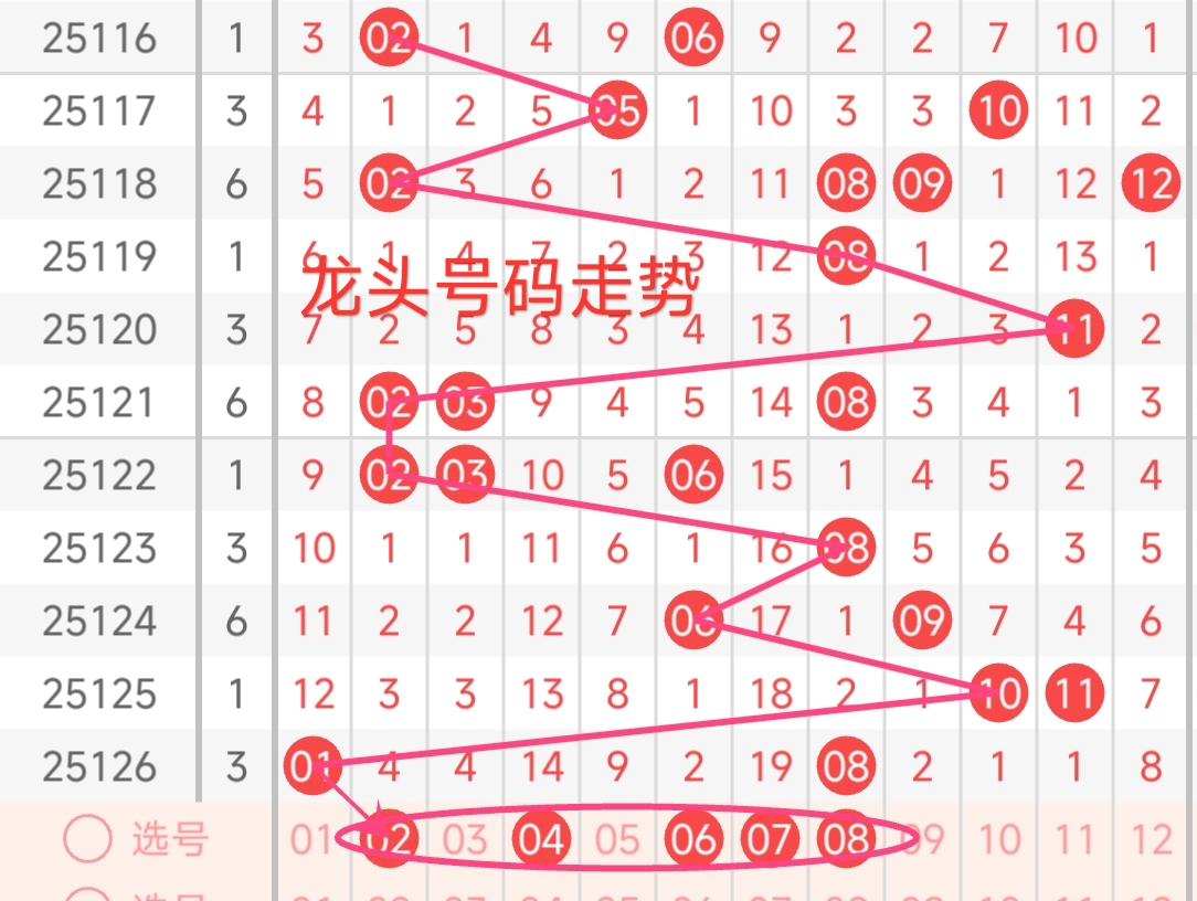 上期龙头号码为01,振幅下降了9点,开出奇数号码。从近期龙头号码的走势来看,近期龙头号码波动频繁。上期龙头为01,奇数号码。从近期龙头走势来看,近期龙头号码多在01 - 11之间波动,多为小数号码开出,预计本期龙头号码会继续开出在小数区域号码,本期龙头号码重点关注02-12区间。本期还需注意连续多期漏出的号码,需重点关注,有回补龙头号码的趋势。 综合考虑,本期龙头号码推荐关注:02、04、06、07、08。