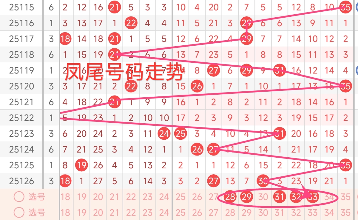 上期凤尾号码为30,振幅下降了5点,开出偶数号码。从近期凤尾号码的走势来看,近期凤尾号码波动较大。上期凤尾为30、偶数号码,近期凤尾号码波动幅度较大,根据近期凤尾号码走势来看,近期凤尾号码在红二区与红三区之间波动开出。近几期凤尾号码在红三区,预计本期凤尾号码仍会在这个区间内,预计本期凤尾号码可能会出现28 - 35的号码。本期还需注意连续多期漏出的号码,需重点关注,有回补凤尾号码的趋势 。综合考虑,本期凤尾号码可以重点关注28、29、31、32、33。