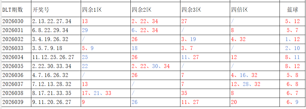 如图,红色字体是重复开出的号码,即为热号。蓝色字体是开出一次的号码,即为冷号。区间走势由冷及热,由热及冷,达到区间平衡。以近10期为一个分析周期:4余2区、4倍数区,走势较冷;4余1区、4余3区,走势较热。依据久热必冷,久冷必热的规律,本期重点关注:4余2区、4倍数区,区间号码可能开出2-3个;4余1区、4余3区,区间号码可能开出1-2个。区间冷热号码精选:***(会员专区可见)。个人分析,仅供参考。