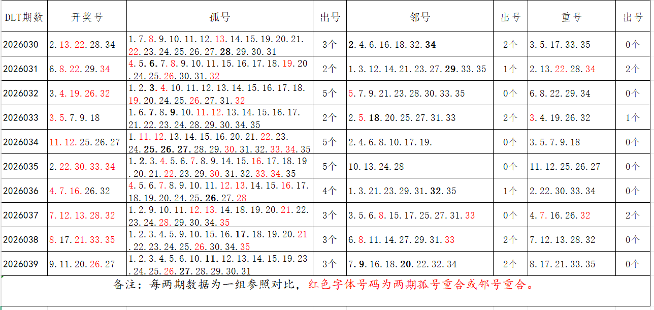 如图,以近两期数据为一组,进行对比分析,相同的孤号、邻号可能在下期开出。本期参考孤号:1.2.3.4.5.6.7.13.14.15.16.17.18.22.23.24.29.30.31.32.33.34.35;邻号:8.10.12.19.21.25.28。重点关注:孤邻号重合号码:***(会员专区可见)。个人分析,仅供参考。