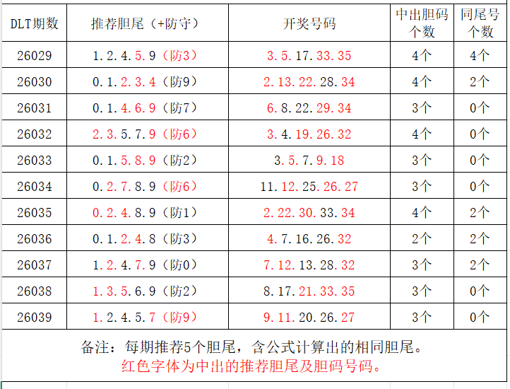 如图,每期推荐胆尾中出1-4个。上期推荐胆尾中出3尾3码!推荐胆尾是按照公式计算的顺序,不定位红球号码的顺序。本期推荐胆尾:9尾/5尾/0尾/6尾/7尾,加推防守胆尾+胆码号码:***(会员专区可见)。个人分析,仅供参考。