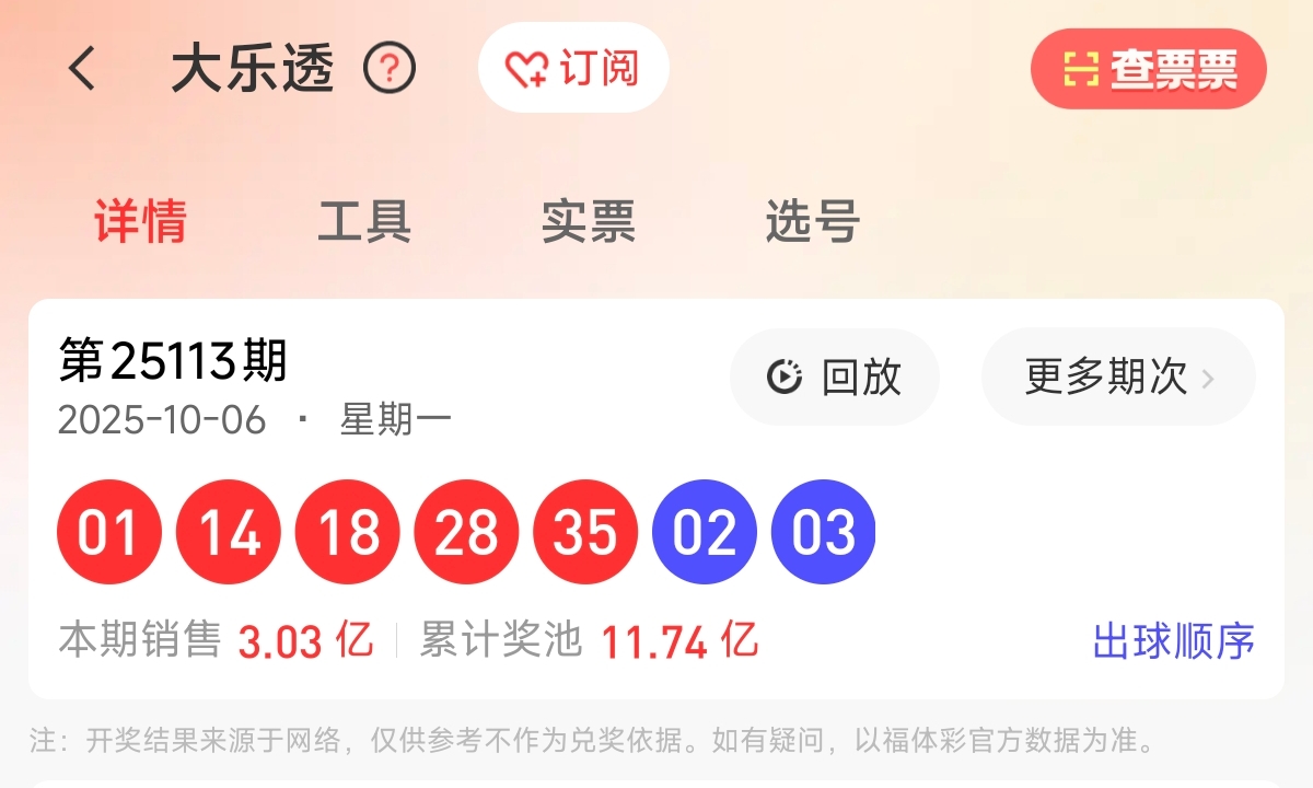首先让我们回顾一下上期大乐透25113期的开奖为01、14、18、28、35,蓝球02、03。前区和值96,前区跨度34,区间比为1:2:2,奇偶比为2:3。