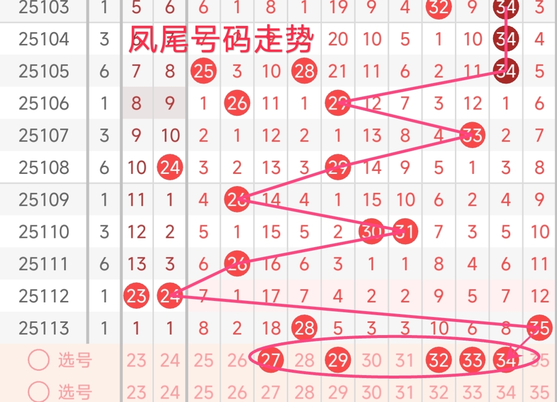 上期凤尾号码为35,振幅上升了11点,开出奇数号码。从近期凤尾号码的走势来看,近期凤尾号码波动较大。上期凤尾为 35,处于高位。近期凤尾号码多在红三区之间波动。上期凤尾号码开出最大数号码,本期凤尾可能会稍有下降。本期凤尾可关注 25 - 34区间开出。 本期还需注意连续多期漏出的号码,需重点关注,有回补凤尾号码的趋势 。综合考虑,本期凤尾号码可以重点关注27、29、32、33、34。