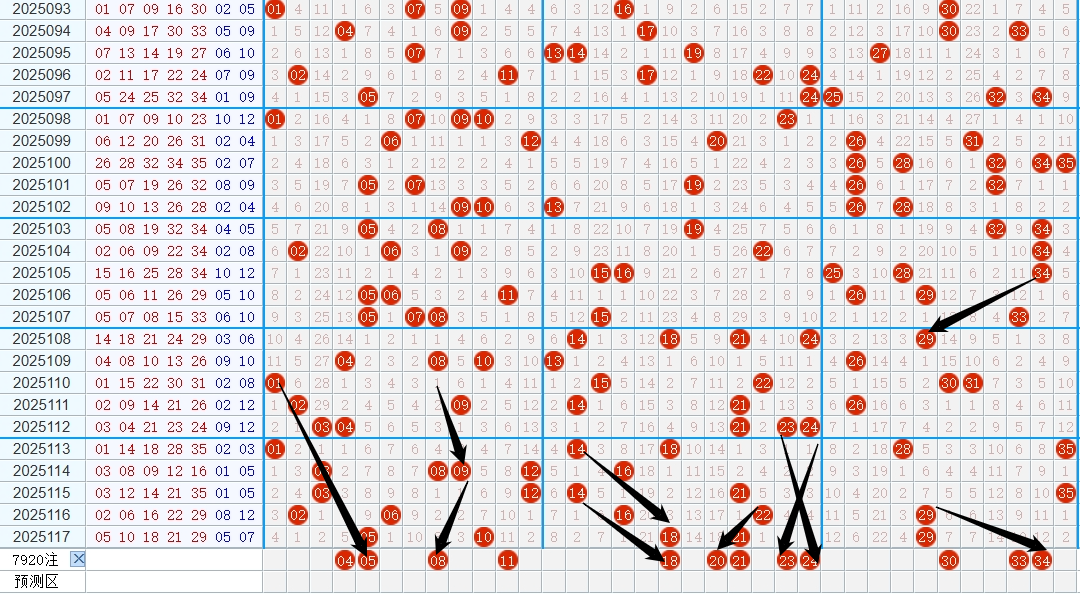 回顾上期25117期开奖05 10 18 21 29+ 05 07,其中一小区01-12出2个,二小区13-24出2个号,三小区25-35出1个!