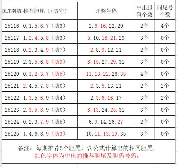 如图,每期推荐胆尾中出1-4个。上期推荐胆尾中出3尾3码!推荐胆尾是按照公式计算的顺序,不定位红球号码的顺序。本期推荐胆尾:9尾/4尾/0尾/8尾/5尾,加推防守胆尾+胆码号码:***(会员专区可见)。个人分析,仅供参考。