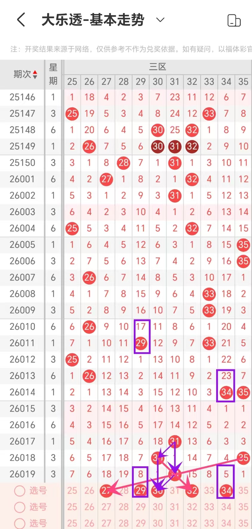 通过对同期次隔三期重号出现的数量规律进行统计分析,本期考虑出号0-1个,即16-17-30-31-35出号0-1个