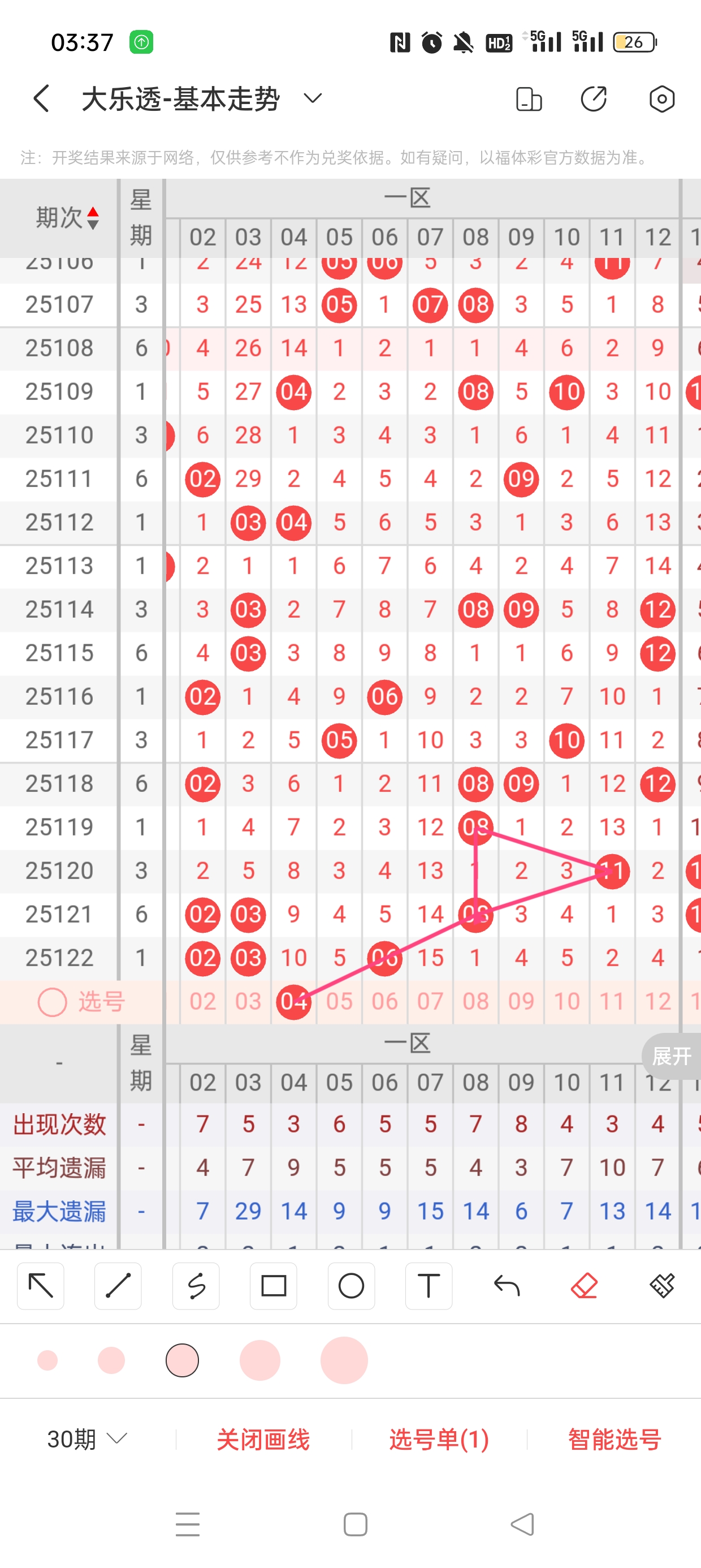 后区(1-12)近120期本区012路64:70:72,1/2路热度高,本期着重0路。1已遗漏3期,与4之间呈现向左遗漏递减态势,需防。