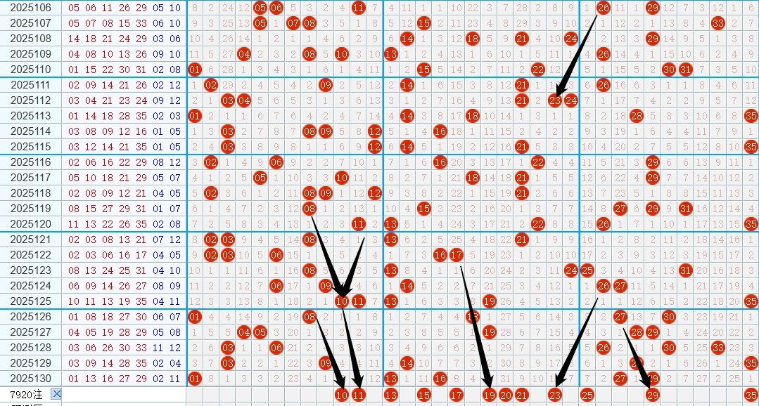 回顾上期25130期开奖01 13 16 27 29+ 02 11,其中一小区01-12出1个,二小区13-24出2个号,三小区25-35出2个!
