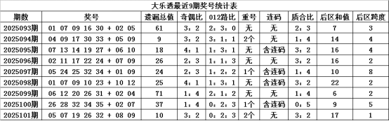 体彩大乐透第2025101期奖号为:05 07 19 26 32 + 08 09,各位号码遗漏期数分别为:3期、2期、5期、0期、0+13期、3期,前区号码遗漏总期数为10期,012路比为023,奇偶比为32,包含2个重复号码:2632。后区号码遗漏总期数为16期,和值为17跨度为1