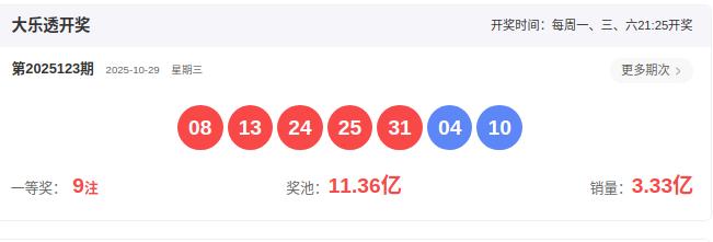 开奖号码:08 13 24 25 31- 04 10