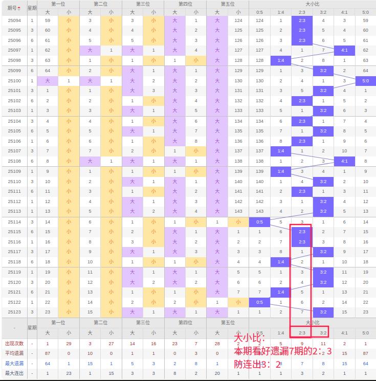 上期大小比:3:2,近10期大小比出现情况:0:5、2:3、2:3、3:2、1:4、3:2、3:2、1:4、0:5、3:2,最近10期出现4期3:2,出现2期2:3,出现0期4:1,出现2期1:4,出现0期5:0,出现2期0:5,根据近10期规律本期看好遗漏7期的3:2,防连出3:2,综上所述推荐大小比推荐:3:2,重点关注:2:3。