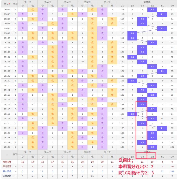 上期奇偶比:3:2,近10期奇偶比出现情况:2:3、3:2、1:4、3:2、2:3、4:1、3:2、3:2、2:3、3:2,最近10期出现5期3:2,出现3期2:3,出现1期4:1,出现1期1:4,出现0期5:0,出现0期0:5,根据近10期规律本期看好连出3:2,防10期循环开出2:3,综上所述推荐奇偶比推荐:2:3,重点关注:3:2。