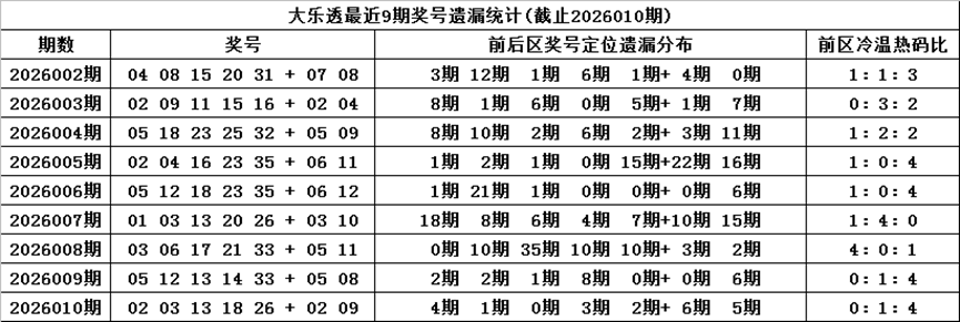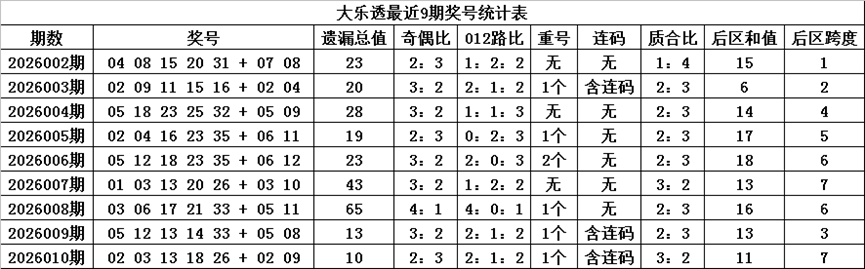 体彩大乐透第2026010期奖号为:02 03 13 18 26 + 02 09,各位号码遗漏期数分别为:4期、1期、0期、3期、2期+6期、5期,前区号码遗漏总期数为10期,012路比为2:1:2,奇偶比为2:3,包含1个重复号码:13。后区号码遗漏总期数为11期,和值为11,跨度为7。