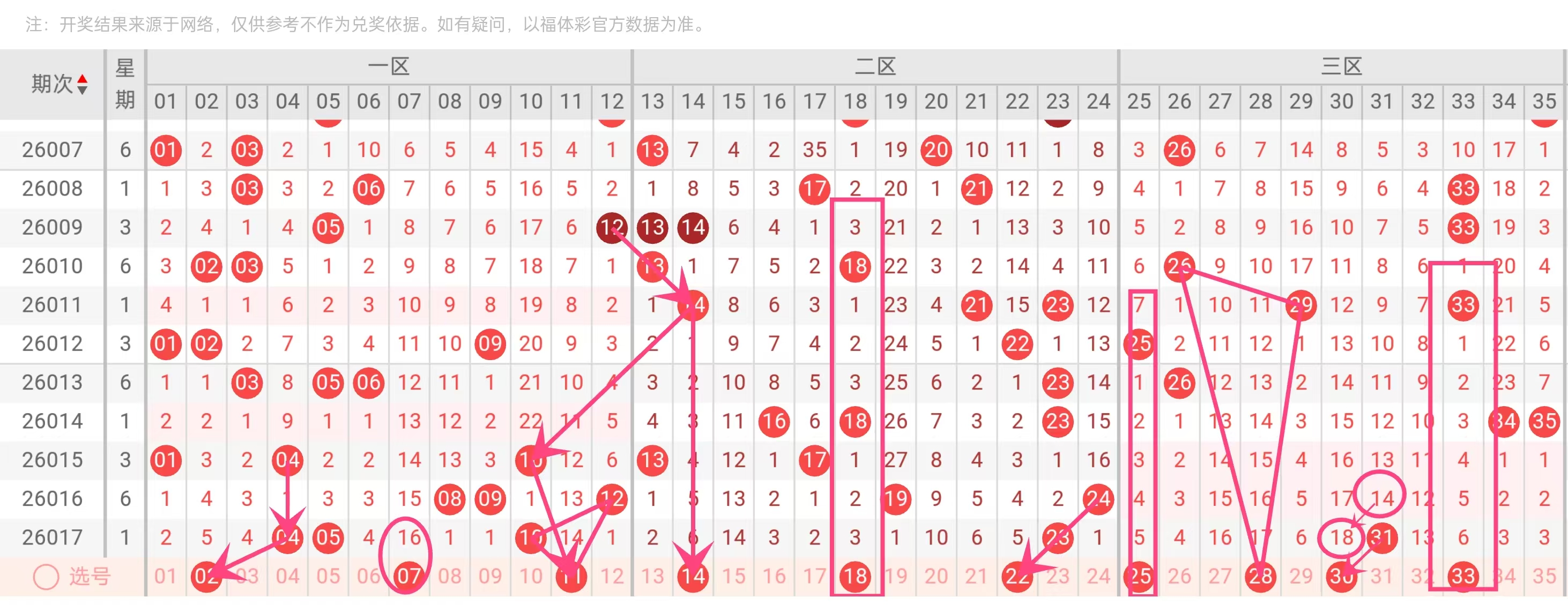 中号区(13-24):选取14、18、22,其中18在2026014期刚出现,有重复可能;22作为遗漏8期的温号,回补概率较高;