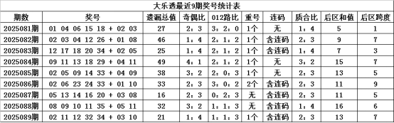 体彩大乐透第2025089期奖号为:02 11 12 32 34 + 03 10,各位号码遗漏期数分别为:2期、0期、5期、9期、5+1期、2期,前区号码遗漏总期数为21期,012路比为113,奇偶比为14,包含1个重复号码:11。后区号码遗漏总期数为3期,和值为13,跨度为7