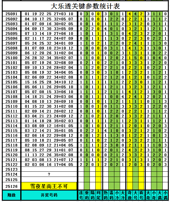 以下是作者手工统计的大乐透关键参数统计表,对喜欢参数分析、过滤缩水、选号胆杀的技术性大乐透爱好者有所帮助,其它读者可略过不看。