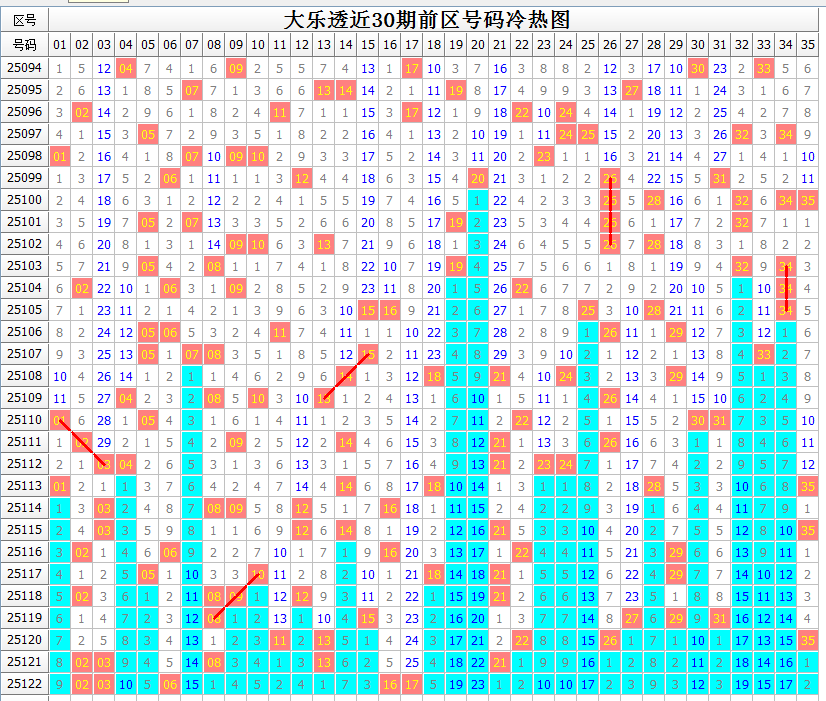 大乐透近30期前区号码冷热图(数字为遗漏期数,蓝色标记的为遗漏超过10期的大冷号)