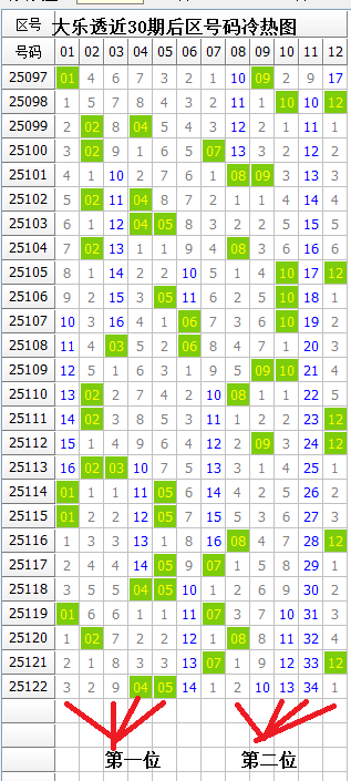 大乐透近30期后区号码冷热图(数字为遗漏期数,蓝色标记的为遗漏超过10期的大冷号)