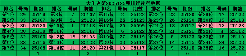 超级大乐透前区是从01-35的号码中每期开出5个号码,把历史数据按照出现次数排行后分成五个区,每个区7个号码,前二位的号码是热位号,中三位的号码是温位号,后二位的号码是冷位号,理论上每个区每期是开1个号码,对比最近开出的数据分析: