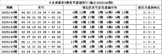 体彩大乐透第2025148期奖号为:03 04 14 30 32 + 08 12,各位号码遗漏期数分别为:4期、4期、5期、8期、12+0期、4期,前区号码遗漏总期数为33期,012路比为212,奇偶比为14,没有开出重复号码。后区号码遗漏总期数为4期,和值为20,跨度为4