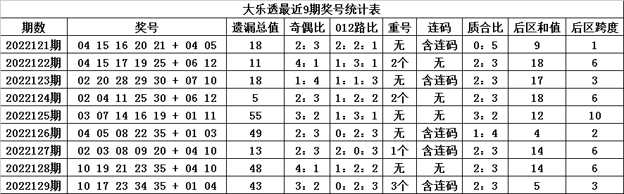 体彩大乐透第2022129期奖号为:10 17 23 34 35 + 01 04,各位号码遗漏期数分别为:0期、6期、0期、37期、0期+2期、0期,前区号码遗漏总期数为43期,012路比为0:2:3,奇偶比为3:2,包含3个重复号码:10、23、35。后区号码遗漏总期数为2期,和值为5, 跨度为3。