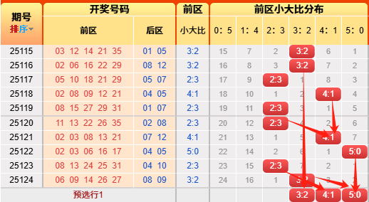 上期前区小大比3:2,近期统计53期中47期。言归正传我们继续用历史数据说话,前区小大比分成6种0:5、1:4、2:3、3:2、4:1、5:0(如图),我统计了一下历史出现次数,0:5出现106次、1:4出现513次、2:3出现966次、3:2出现804次、4:1出现350次,5:0出现53次,再看近10期小大比出现次数比为0:0:4:3:2:1,通过历史数据对比观察以及根据遗漏对称理论原则,故本期我们选择5:0、3:2、4:1;(具体精准方向请查看小车小大比精选)