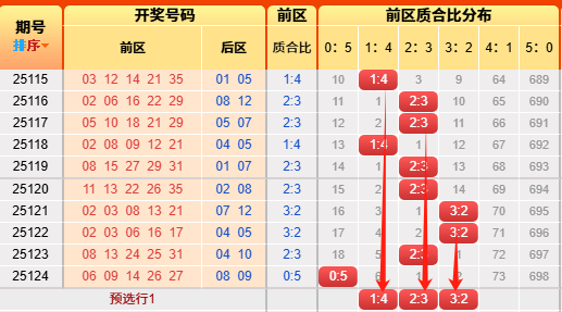 上期质合0:5,出冷了,近44期命中42期范围。来看历史次数统计0:5出现269次、1:4出现901次、2:3出现1006次、3:2出现509次、4:1出现100次、5:0出现7次,再看近十期质合比出现的次数比1:2:5:2:0:0,冷值5:0暂时放弃,再结合图形来看,本期趋势看顺路,初步选择为3:2、1:4、2:3。(具体请点击本条上车查看精选质合比 )
