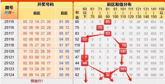 上期开出和值82,又又命中和值范围。本次我们先根据历史次数统计,和值60以下开出246次、61-70开出234次、71-80开出367次,81-90开出479次、91-100开出491次,101-110开出380次、111-120开出312次、121-130开出155次、131-140开出90次、141-150开出26次、150以上开出9次,再来看近十次以上和值分别开出了4次、0次、1次、2次、0次、3次、0次、0次、0次、0次、0次 ,低于阈值的有60区间以下、61-70区间、81-90区间、91-100区间、101-110区间、121-130区间,再根据遗漏斜率对称理论,本期注意60以下、61-70区间、71-80区间、91-100区间,111-120区间。