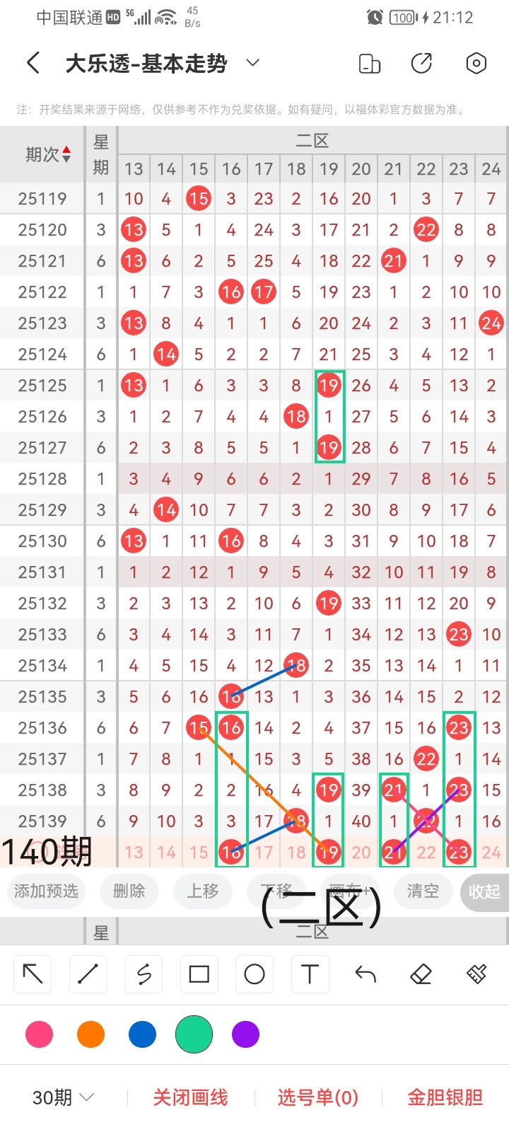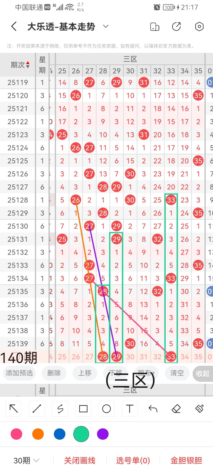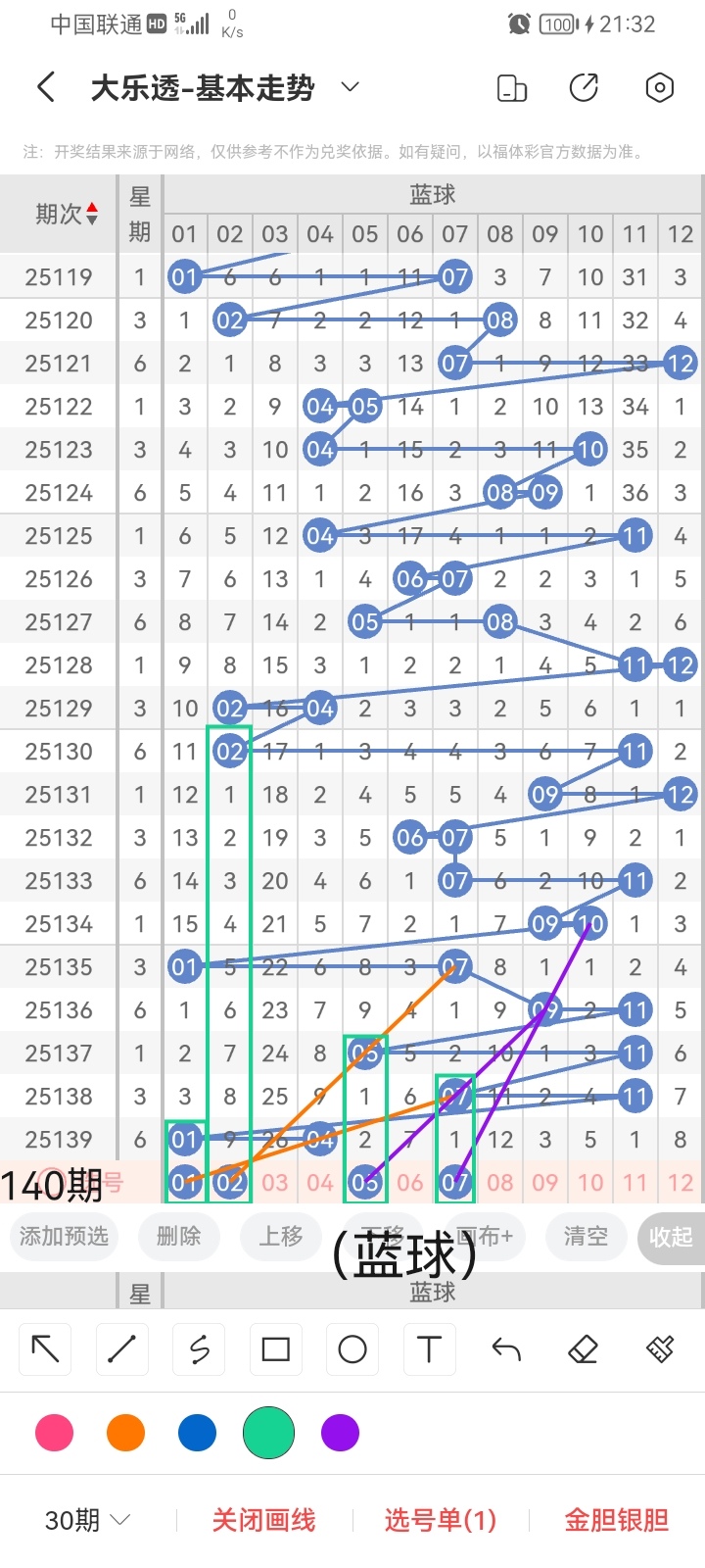 小梁根据图中画线思路,最后给大家汇总提供一下大乐透本期红球、蓝球数据,供大家参考: