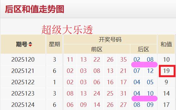 近五期大乐透开奖号码后区和值依次为10→19→9→14→17。后区和值均值为14。后区和值振幅为10,后区和值修正振幅为8。基于动态平衡干预以及波动趋势衡量,本期后区和值推测区间为6-22。基于风险对冲策略,本期后区和值区间缩水为14-21。