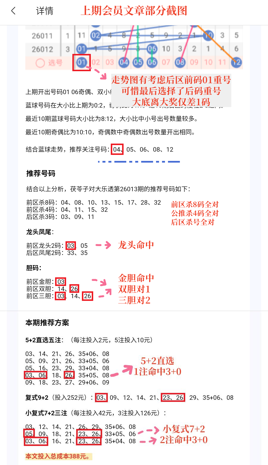 上期前区杀8码全对,公推杀4码全对,后区杀3码全对。会员文章中金胆命中,双胆对1,三胆对2,龙头命中。