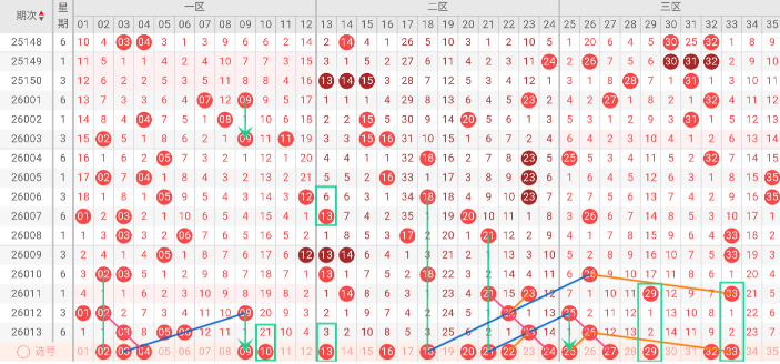 三区(25-35)分析:上期该区开出号码26,近10期占比24%,与上期相比+2%。本期无三斜连号趋势,无隔码斜连走势。