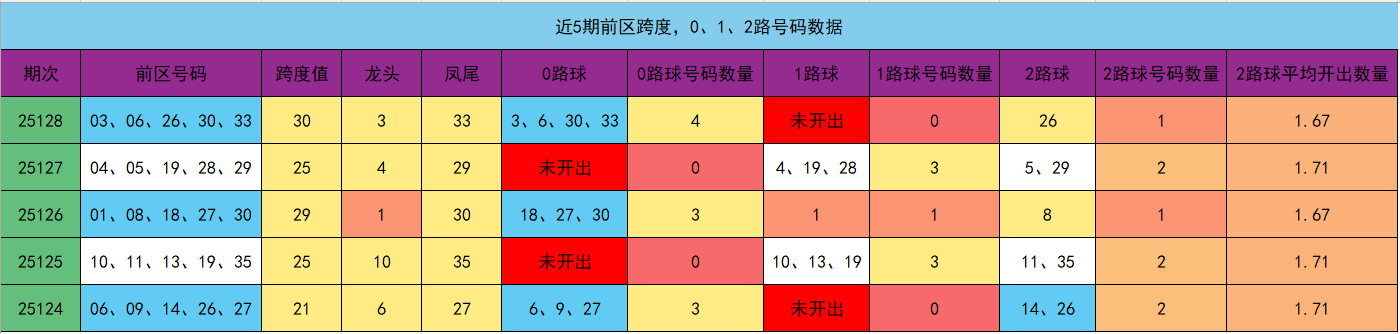 012路比: 上期0路开出2枚(03, 06, 30, 33),1路开出0枚(未开出),2路开出2枚(26)。本期关注1路号码回补,推荐比例 4:0:1。