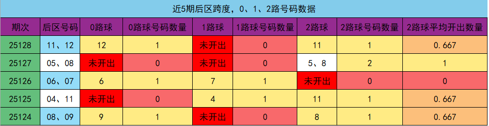 前区重点:重点关注二区(13-24)断区后的强力回补,同时注意大小比从全大极端值向小号回调,防范连号在14-22区域出现。
