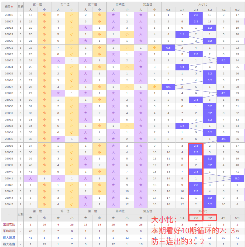 上期大小比:3:2,近10期大小比出现情况:2:3、2:3、3:2、3:2、2:3、5:0、2:3、2:3、3:2、3:2,最近10期出现4期3:2,出现5期2:3,出现0期4:1,出现0期1:4,出现1期5:0,出现0期0:5,根据近10期规律本期看好10期循环的2:3,防三连出3:2,综上所述推荐大小比推荐:3:2,重点关注:2:3。