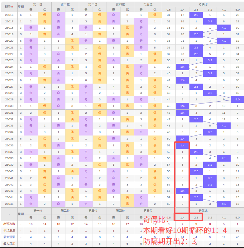 上期奇偶比:4:1,近10期奇偶比出现情况:1:4、2:3、4:1、3:2、2:3、3:2、3:2、1:4、2:3、4:1,最近10期出现3期3:2,出现3期2:3,出现2期4:1,出现2期1:4,出现0期5:0,出现0期0:5,根据近10期规律本期看好10期循环出的1:4,防隔期出2:3,综上所述推荐奇偶比推荐:2:3,重点关注:1:4。