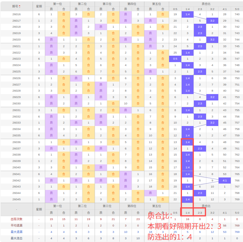 上期质合比:1:4,近10期质合比出现情况:1:4、2:3、1:4、1:4、1:4、1:4、4:1、1:4、2:3、1:4,最近10期出现0期3:2,出现2期2:3,出现1期4:1,出现7期1:4,出现0期5:0,出现0期0:5,根据近10期规律本期看好隔期出2:3,防连出的1:4,综上所述推荐质合比推荐:1:4,重点关注:2:3。