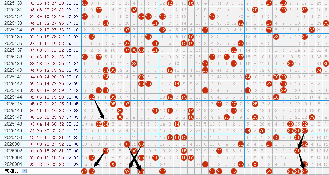 回顾上期26004期开奖05 18 23 25 32+ 05 09,其中一小区01-12出1个,二小区13-24出2个号,三小区25-35出2个!