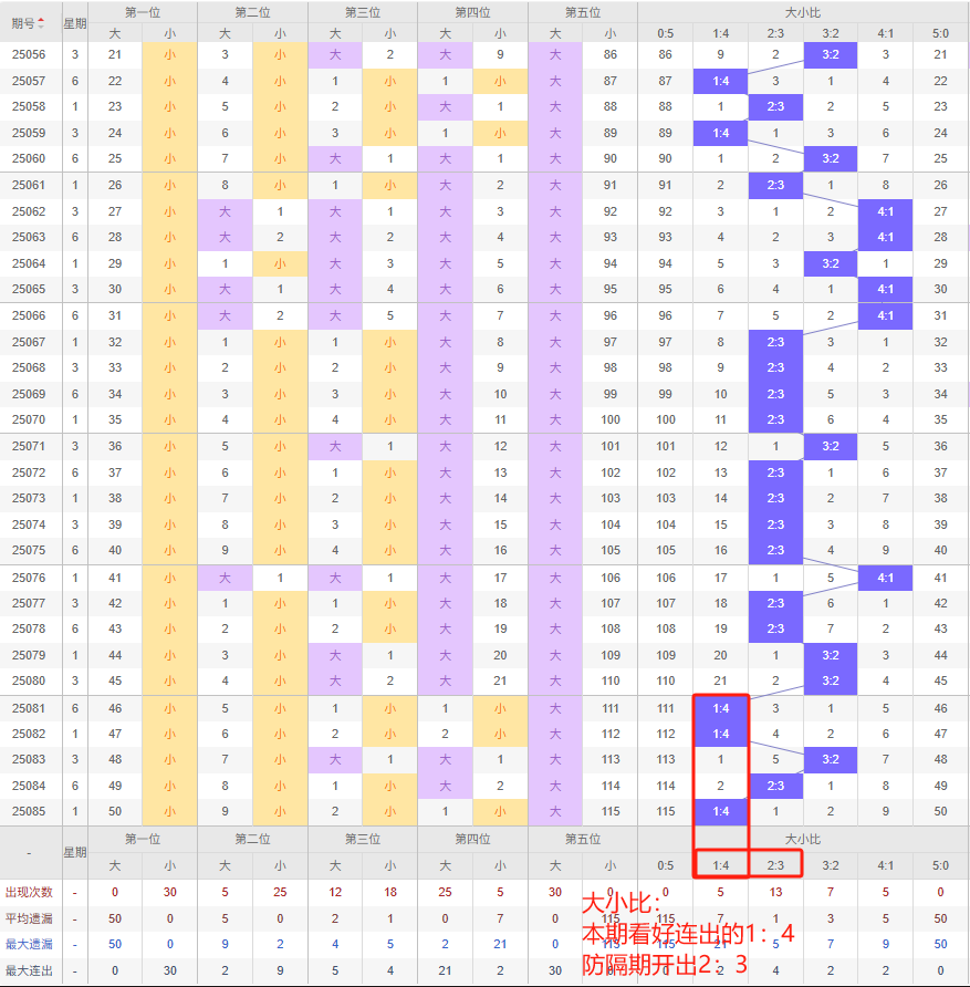 上期大小比:1:4,近10期大小比出现情况:4:1、2:3、2:3、3:2、3:2、1:4、1:4、3:2、2:3、1:4,最近10期出现3期3:2,出现3期2:3,出现1期4:1,出现3期1:4,出现0期5:0,出现0期0:5,根据近10期规律本期看好连出的1:4,防隔期开出2:3,综上所述推荐大小比推荐:2:3,重点关注:1:4。