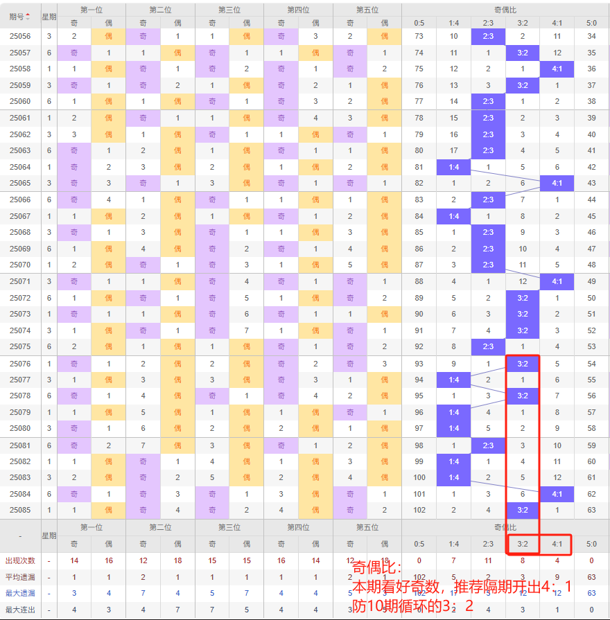 上期奇偶比:3:2,近10期奇偶比出现情况:3:2、1:4、3:2、1:4、1:4、2:3、1:4、1:4、4:1、3:2,最近10期出现3期3:2,出现1期2:3,出现1期4:1,出现5期1:4,出现0期5:0,出现0期0:5,根据近10期规律本期看好隔期开出4:1,防10期循环的3:2,综上所述推荐奇偶比推荐:3:2,重点关注:4:1。