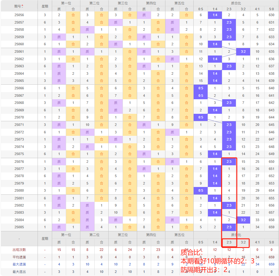 上期质合比:2:3,近10期质合比出现情况:2:3、1:4、1:4、1:4、0:5、1:4、2:3、1:4、3:2、2:3,最近10期出现1期3:2,出现3期2:3,出现0期4:1,出现5期1:4,出现0期5:0,出现1期0:5,根据近10期规律本期看好10期循环的2:3,防隔期开出3:2,综上所述推荐质合比推荐:3:2,重点关注:2:3。