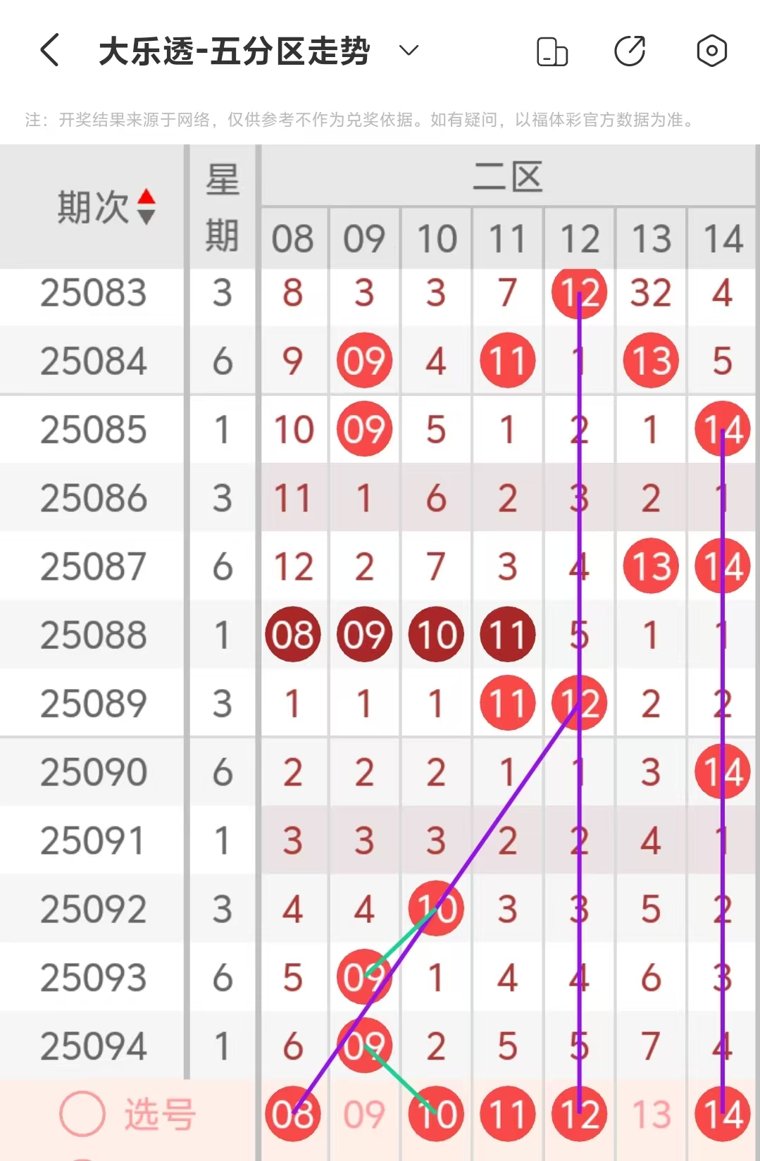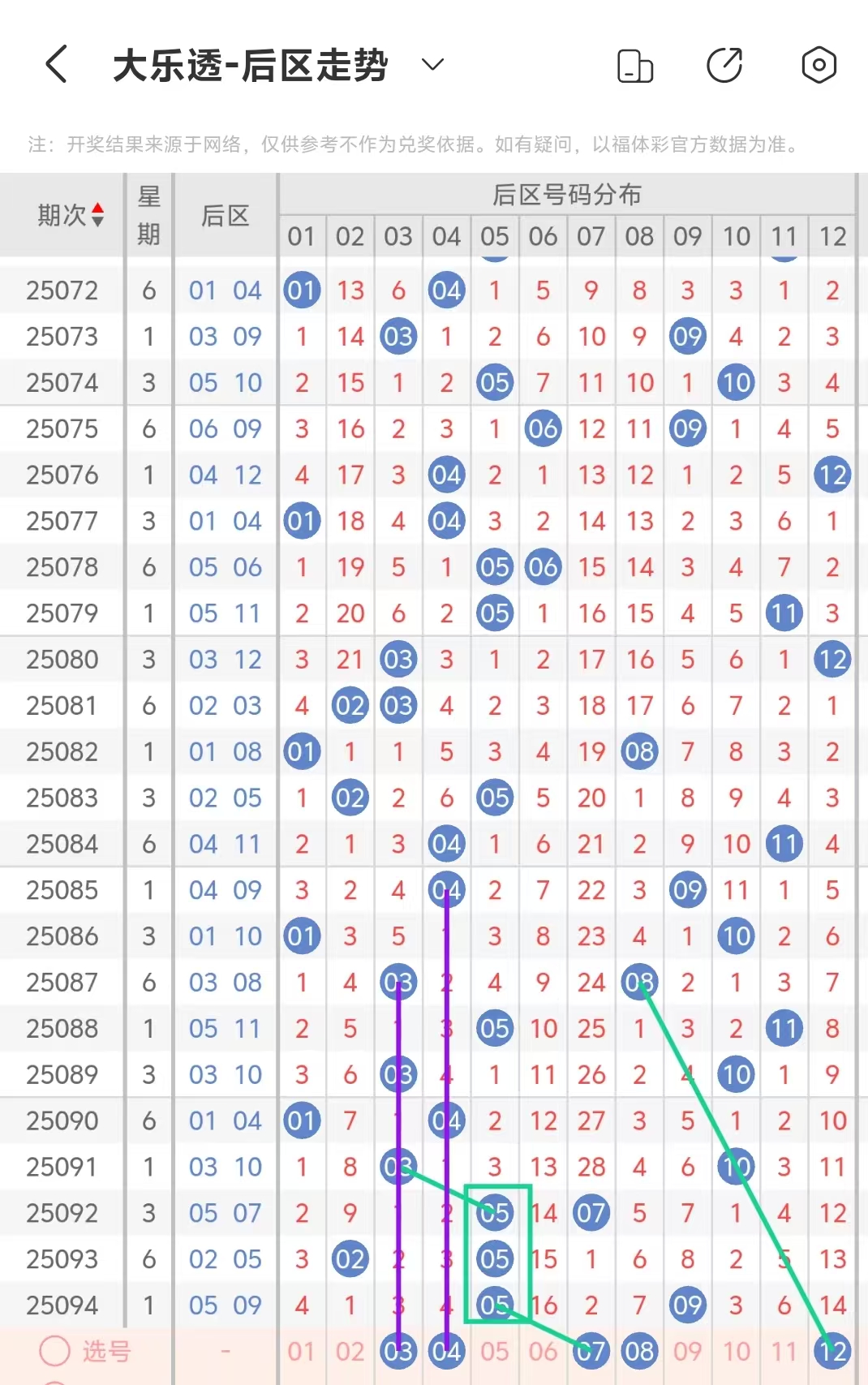 后区是从01-12号每期开出2个号码,在23期中,理论上每个号码应该出现3.8次,超出4次的号码是热号,低于3次的号码是冷号,出现3-4次的号码是温号。
