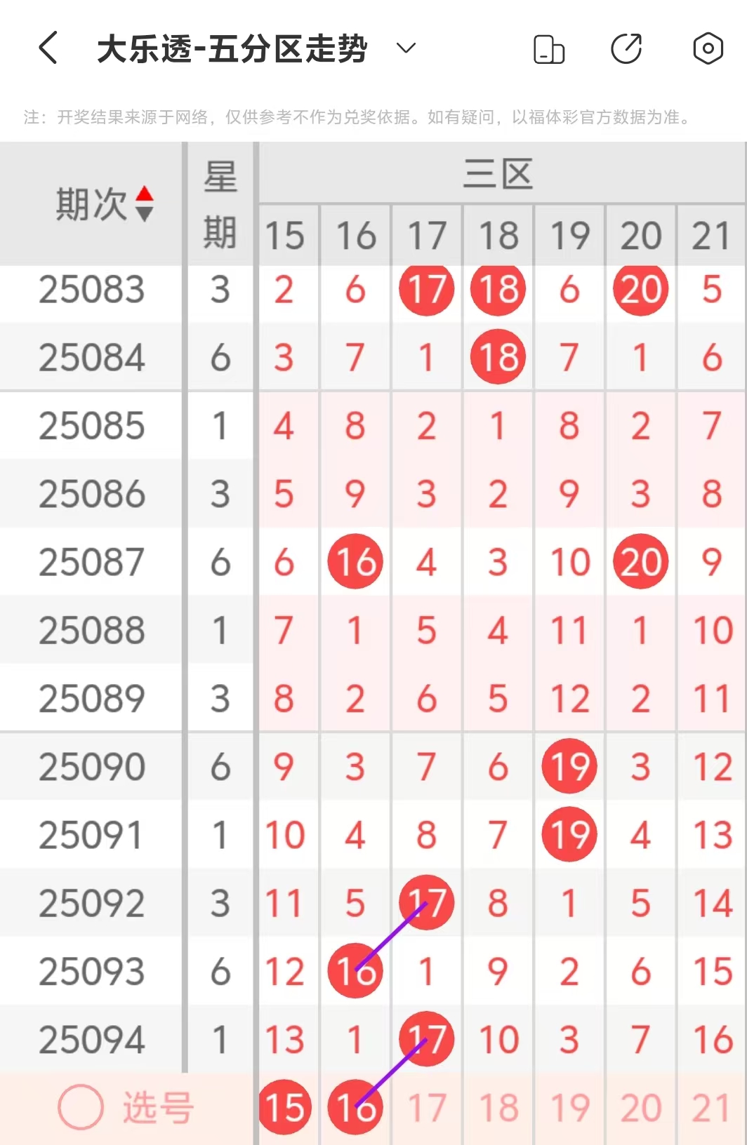 三区15-21号在23期中合计开出26个号码(理论值23个,多3个):