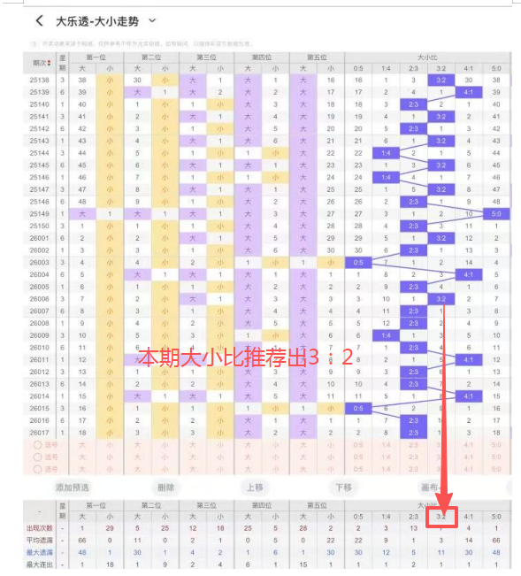 5、大小比:上期开出大小比为2:3,近112期开出4:1出现24次,3:2出现46次,2:3出现49次,1:4出现29次,5:0出现4次,本期推荐出3:2,防守出2:3。