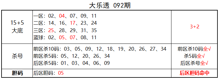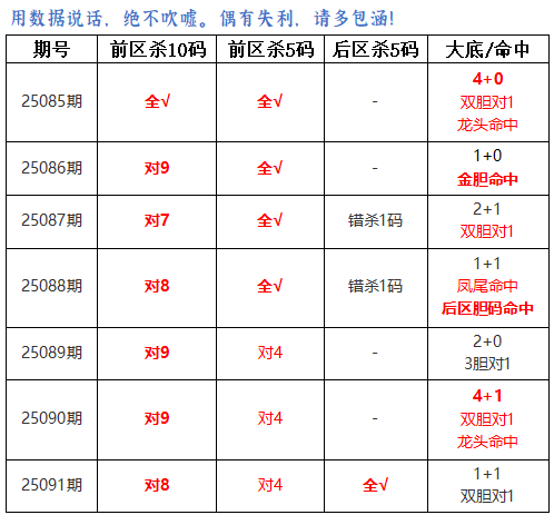 上期前区杀10码全对,免费文章中杀5码全对,后区杀5码全对,后区独胆命中,大底命中3+2,本期再接再厉!