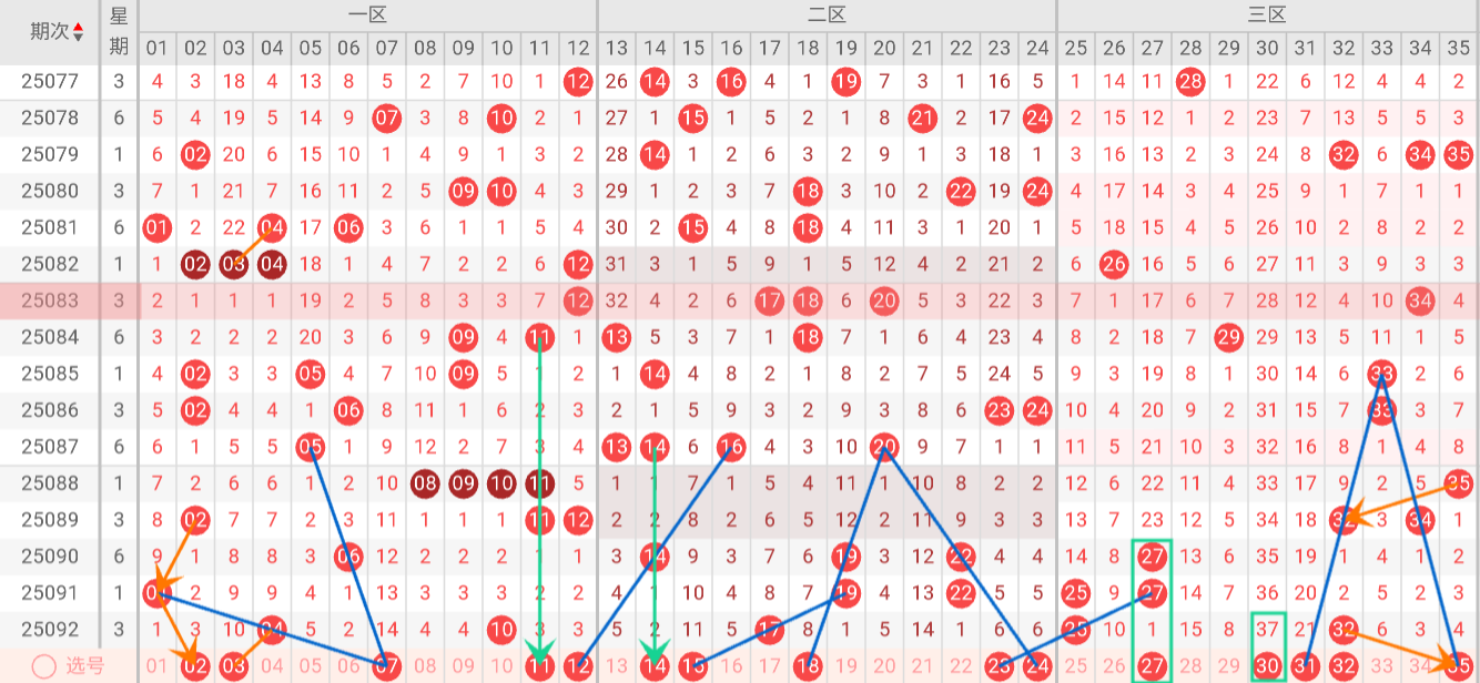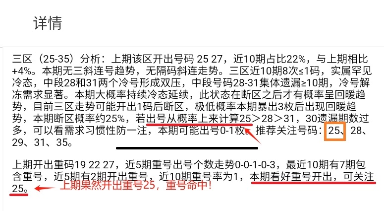 三区(25-35)分析:上期该区开出号码25 32,近10期占比22%,与上期相比+4%。本期无三斜连号趋势,隔码斜连走势:31 35。近5期最低1码,最高2码,没有出现断区,整体表现有稳定趋势。最近连续两期稳定在2码,热度有所上升。本期出号可能继续稳定在2枚。推荐关注号码:27、30、31、32、35。