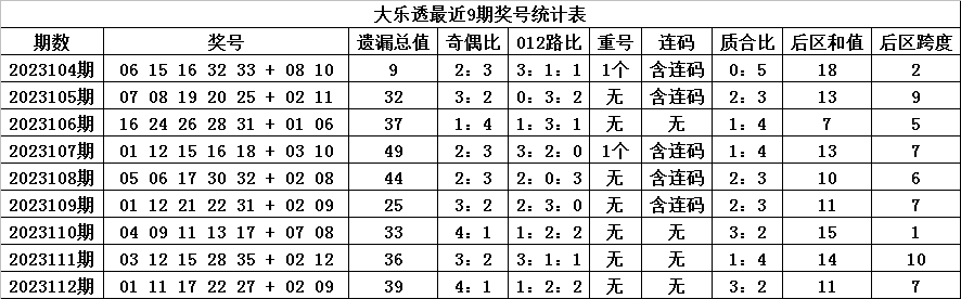 后区跨度:后区近9期跨度分别开出2-9-5-7-6-7-1-10-7,跨度奇偶比为6:3,上期跨度下降3个点位,本期防跨度再次下降,注意奇数跨度出现,关注跨度1。