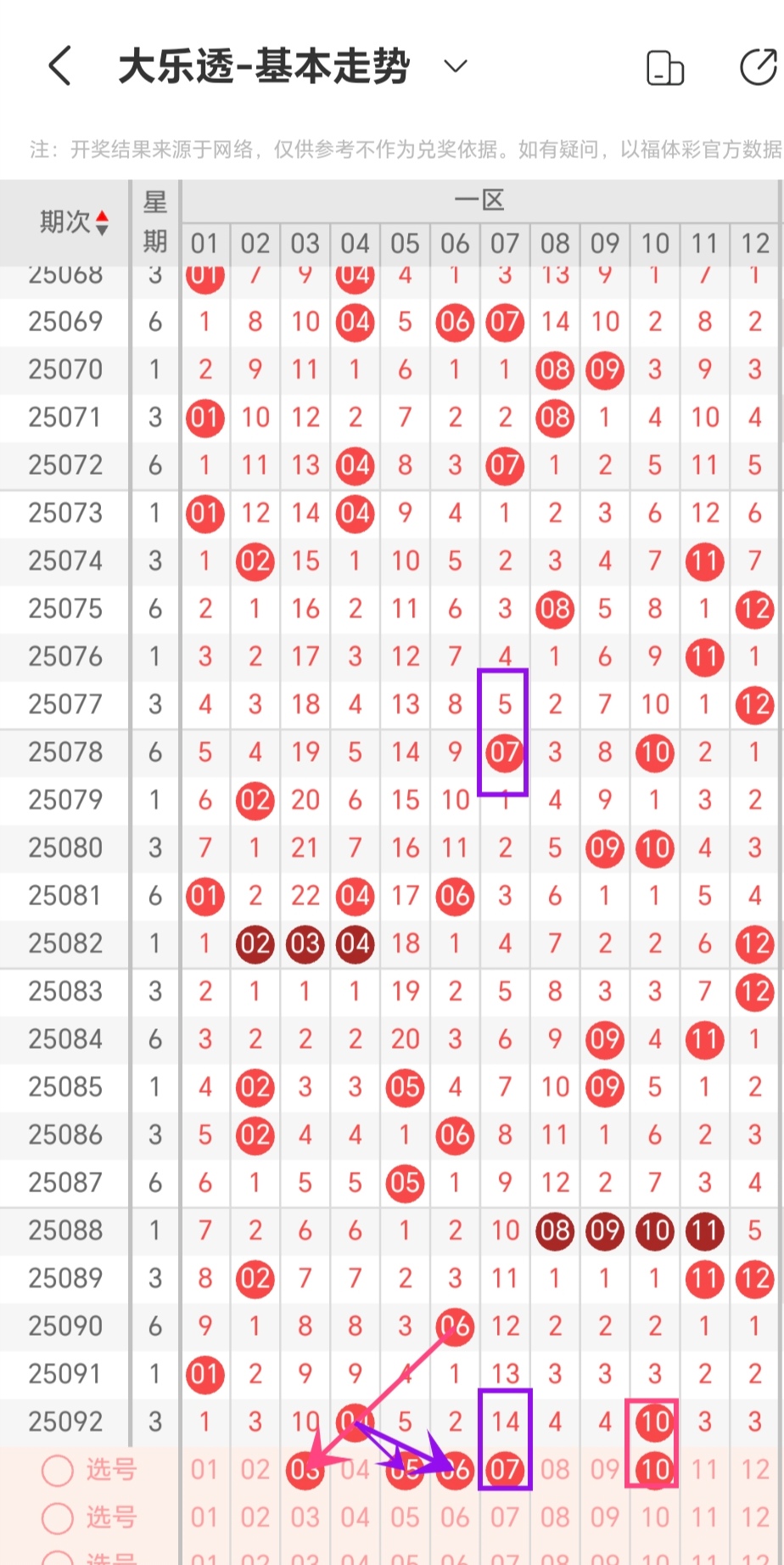 近期大乐透会员文章的红球杀号比较稳定连续两期红球杀号15码错1码,目前社区公推重要数据条件(两码出号1-2个,三码出号1-2个)一共31期对了25期,个人在重要数据方面准确度很高,方便大家拿到大概率出奖号的胆码,在我的会员文章里这样的重要条件一共6组,每次的准确度在70%-80%之间,最好的一次记录是红球杀号12码全对,6组重要数据条件全对开出奖号4