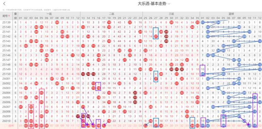 上一期后区开出02-09,后区奇偶比为1:1,大小比为1:1,质合比为1:1;本期后区需要关注的号码:01为邻号;02可能会重出;05为隔期码;10与08-09形成了斜连走势;10-11可能会同时落号;因此本期后区看好01-02-05-10-11等号码。